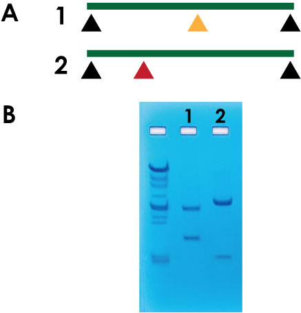 If we analyze several different polymorphisms within a person’s genome, we can generate a unique “DNA fingerprint”. After DNA is extracted from biological samples, scientists use the polymerase chain reaction (PCR) to amplify specific places (loci) throughout the genome. The PCR products are analyzed using agarose gel electrophoresis. The PCR products appear on the gel as a series of bands with various sizes (Fig. 1B). Because DNA samples from different individuals produce different patterns of bands, scientists can use a DNA fingerprint to distinguish between individuals. Since polymorphisms are inherited, DNA fingerprints can be used to determine paternity/maternity (and other familial relationships).