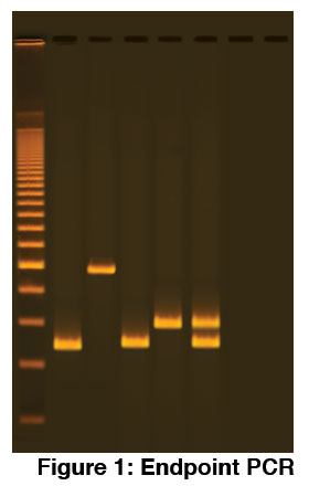 A qPCR reaction is a PCR reaction with fluorescent dyes added (Figure 2). These fluorescent dyes let off a signal every time a strand of DNA is doubled. Consequently the amount of the fluorescence released during amplification is directly proportional to the amount of amplified DNA. This has some major advantages. By using a fluorescent reporter in the reaction, it is possible to tell if a sequence is present/absent without the second gel step. Also qPCR can accurately tell us the original amount of DNA in a sample. Such information is useful for monitoring the genetic expression of a particular gene and for detecting infectious diseases, cancer, and genetic abnormalities.