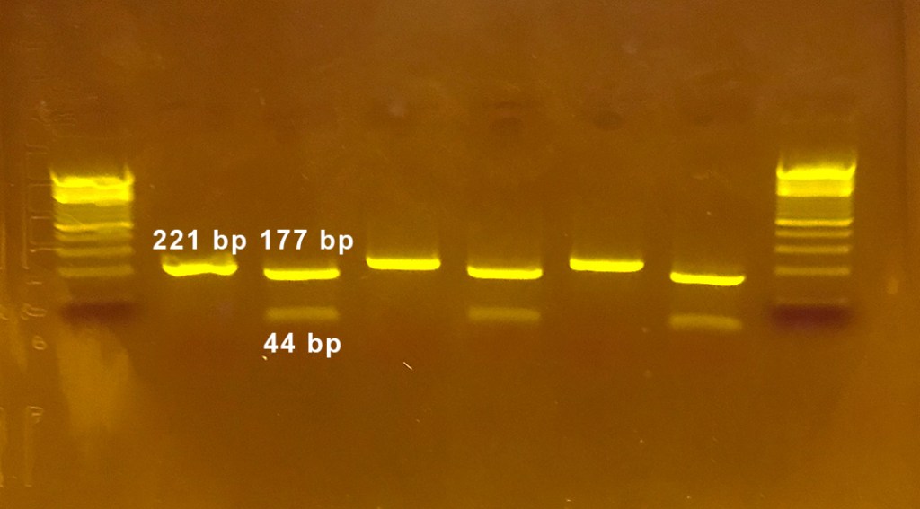 The results on the gel below are from our “Exploring the Genetics of Taste: SNP Analysis of the PTC Gene using PCR” experiment. These samples were amplified by polymerase chain reaction and then run for 10 minutes on the EDGE. Even the smallest 44 bp DNA bands are easily distinguishable!