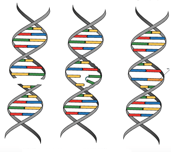 When DNA degrades it generally changes shape in one of three ways. The first, cross-linking, occurs when two nearby nucleotides form a new covalent bond. The second, deamination, is when one of the four nucleotides (cytosine, thymine, guanine, or adenine) loses an amino group. The third, fragmentation, is when the DNA strand is broken into smaller pieces.