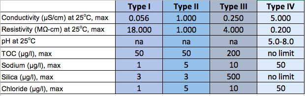 - Feed or Raw Water (Type VI) – Tap water whose contents vary widely depending on its source.