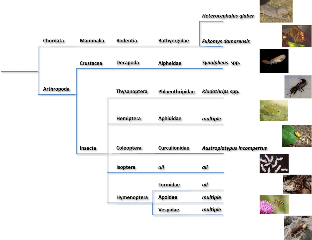Phylogeny studies of the Synalpheus genus based on both genetic data and physical traits show an interesting pattern. Although eusociality appears only in this one genus among all marine animals, within the genus the trait pops up in different branches. This suggests that the trait has independently evolved multiple times.