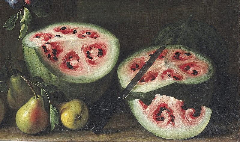 Historical evidence indicates that the transition from bitter to sweet watermelon did not take long. Hebrew tax records from 200 AD show watermelon grouped with other sweet fruits like grapes, figs, and pomegranates. Another indicator? Paintings of increasingly pink watermelons. The genes that color watermelon’s interior neighbor the CIVST1 gene. Consequently, in the vast majority of cases, a redder watermelon equals a sweeter watermelon.