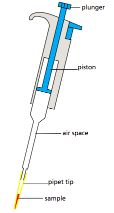 - ASPIRATE: Create a vacuum by pushing the plunger down and placing the tip into the sample. Then slowly release the plunger. Finally, pause to make sure the liquid has moved into the tip. This step is slightly complicated by the fact that most micropipettes have two plunger positions. Depressing the button to the first “soft” stop results in the correct amount being aspirated. However, depressing the button to the second “hard” stop creates a larger vacuum than desired.