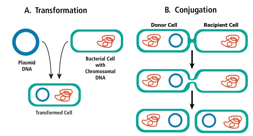 In nature, bacteria pass small pieces of DNA back and forth in two unique ways, which we call transformation and conjugation. In transformation, a bacterium takes up free DNA from the surrounding environment. Some bacteria, like H. influenzae, do this naturally to acquire new DNA. Other bacteria, like E. coli, can be forced to take up DNA and become transformed, even though they are not naturally competent. In contrast, conjugation relies upon direct contact between two bacterial cells. A piece of DNA is copied in one cell (the donor) and then is transferred into the other (recipient) cell through a bridge-like connection. In both cases, the bacteria have acquired new genetic information that is both stable and heritable. Although not essential for the cell’s survival, this DNA can provide an advantage. For example, the gene that codes for beta-lactamase, the enzyme that provides resistance to the antibiotic ampicillin, is found on a plasmid can be passed between bacteria. This gene impacts the way doctors treat people with specific diseases.