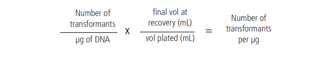 The data is then plugged into the below equation to determine the number of transformants per microgram of DNA. Transformation efficiency generally ranges from 1 x 104 to 1 x 108 cells transformed per μg plasmid.