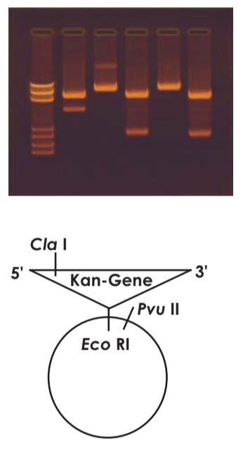 In module 5, the isolated plasmid DNA is then digested with a series of restriction enzymes in order to visualize and confirm the presence of the introduced kanR gene. The restriction enzyme, EcoRI, is used to verify the presence of the kanR gene. The other digestion reactions using PvuII and XhoI can allow you to determine what direction the insert is in and how many inserts there are.