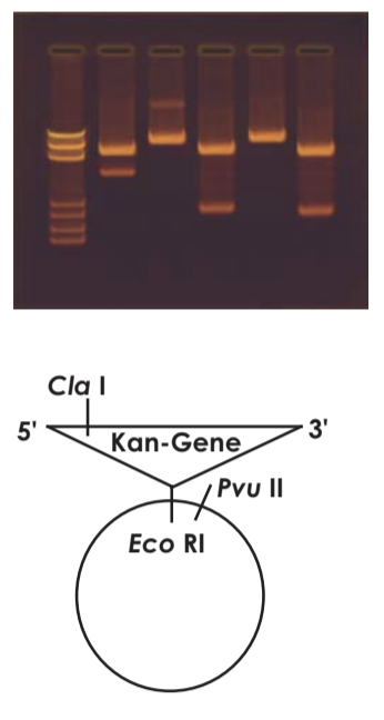 In module 5, the isolated plasmid DNA is then digested with a series of restriction enzymes in order to visualize and confirm the presence of the introduced kanR gene. The restriction enzyme, EcoRI, is used to verify the presence of the kanR gene. The other digestion reactions using PvuII and XhoI can allow you to determine what direction the insert is in and how many inserts there are.