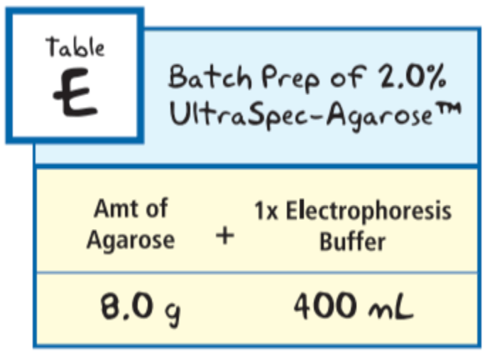 A good place to start is to prepare all of the gels you’ll need for your class at once in bulk. Each experiment requires a different percentage agarose gel, so make sure that you check out the specifications of your experiment before preparing anything. In the Instructor Guide of the experiment literature you’ll be able to find a helpful guide that shows you how much agarose, electrophoresis buffer and water you’ll need!