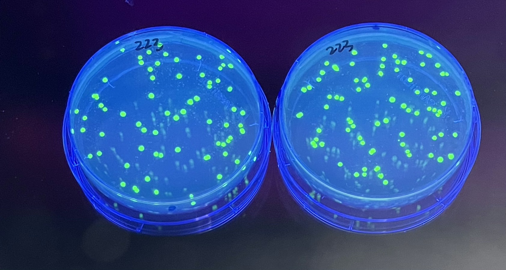 For experiments like our GFP transformation, the plasmid has been engineered to contain the gene for the green fluorescent protein. This is turned on by the promoter in the presence of IPTG, a molecular “on/off” switch. This means that all transformed colonies will appear green, even without the use of a hand-held UV light or a blue light transilluminator. However, if the plates are incubated for longer amounts of time, or even stored in the refrigerator before, you may find small, white colonies pop up next to the transformed colonies. These are our satellite colonies! But what are they, and how do they form?