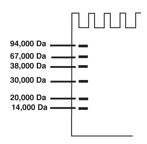 Protein markers are designed to identify the relative size of denatured proteins in an SDS-PAGE gel. In this way, they behave similarly to the DNA markers previously discussed. Edvotek’s Prestained Lyophilized Protein Gel Markers include six protein bands between 14,000 Da and 94,000 Da. Additionally, these proteins are prestained blue, making them easy to identify while the gel is running!