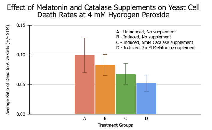 Group A refers to my control group, which was not induced to express alpha-synuclein and did not receive any supplements. All of the other groups were induced, with Group C receiving a catalase supplement, and Group D receiving a melatonin supplement. My results also suggested that at higher concentrations of hydrogen peroxide (meaning a higher degree of oxidative stress), melatonin helped decrease cell death, as shown in the graph below.