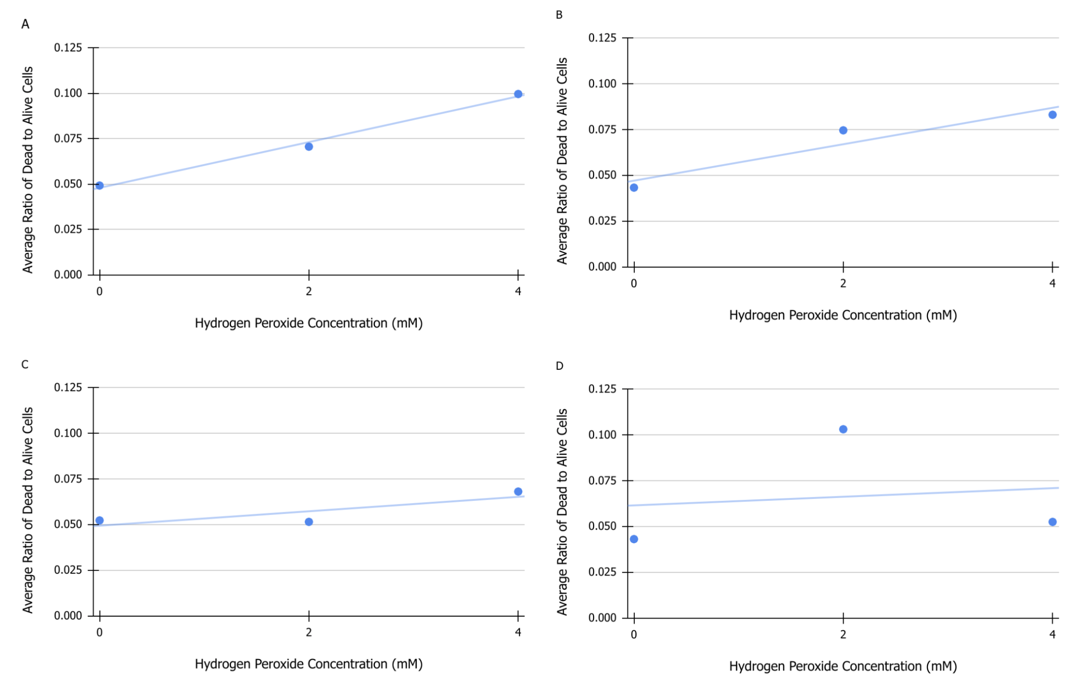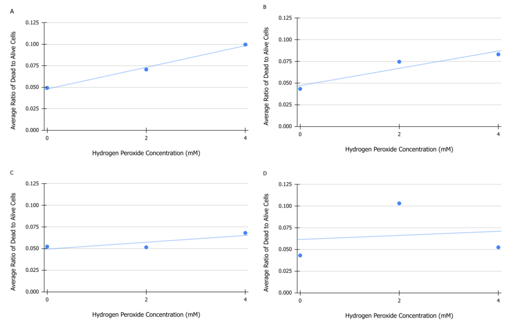Of course, this project was not without its challenges. I spent many months looking for a lab in which I could conduct my experiment, before finally deciding to try to do it at my high school, with my biotechnology teacher’s equipment. Timing also presented many challenges, as the limited time frame of the project meant I was unable to carry out full replicates of my experiment. In the end, I chose to quantify cell survival by putting samples of my yeast cells on microscope slides and staining them with methylene blue, which stains dead cells blue and leaves living cells white. My results suggested a general correlation between increased oxidative stress and cell death, a relationship supported by surrounding studies. Graphs showing this correlation for each of my main treatment groups are below.