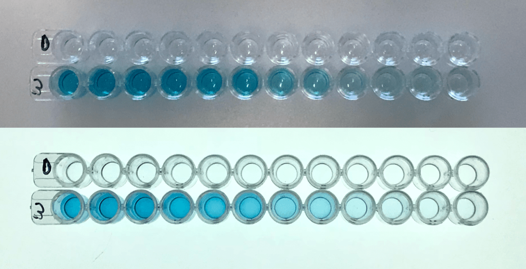 For many experiments, the results will look very different depending on the background that you display them against. This is especially true in experiments where a microtiter plate or petri dish is used. In these cases, we recommend testing different backgrounds to determine the best way to display the results. In addition, backlighting can often make a huge difference in the quality of the image. The pictures below demonstrate results from a blood-typing assay and a quantitative ELISA – the first photo is of the results on a neutral lab bench and then again on a white light transilluminator. In both cases, it’s easy to see how the backlit image changes the appearance of the results.