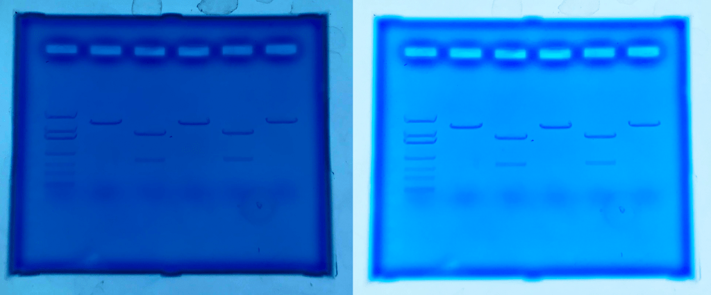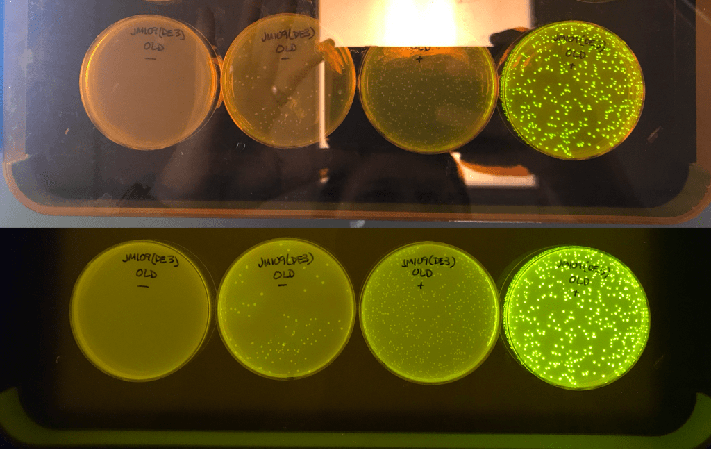One thing that can very quickly ruin a photo is glare from lights in the room. The worst offender for this tends to be overhead lighting, which reflects off of shiny plastic or wet samples and can mask the results. It can be difficult to avoid overhead glare, but turning off lights or positioning the results in a different location in the room can dramatically improve the resulting image. The pictures to the right demonstrate the impact that overhead lights can have when viewing Green Fluorescent Protein-expressing bacteria. The images were taken with the overhead fluorescent lighting on (top) or after shutting the lights off (bottom). As you can see, the image taken in the dark is much easier to analyze and is more representative of the real-world results.