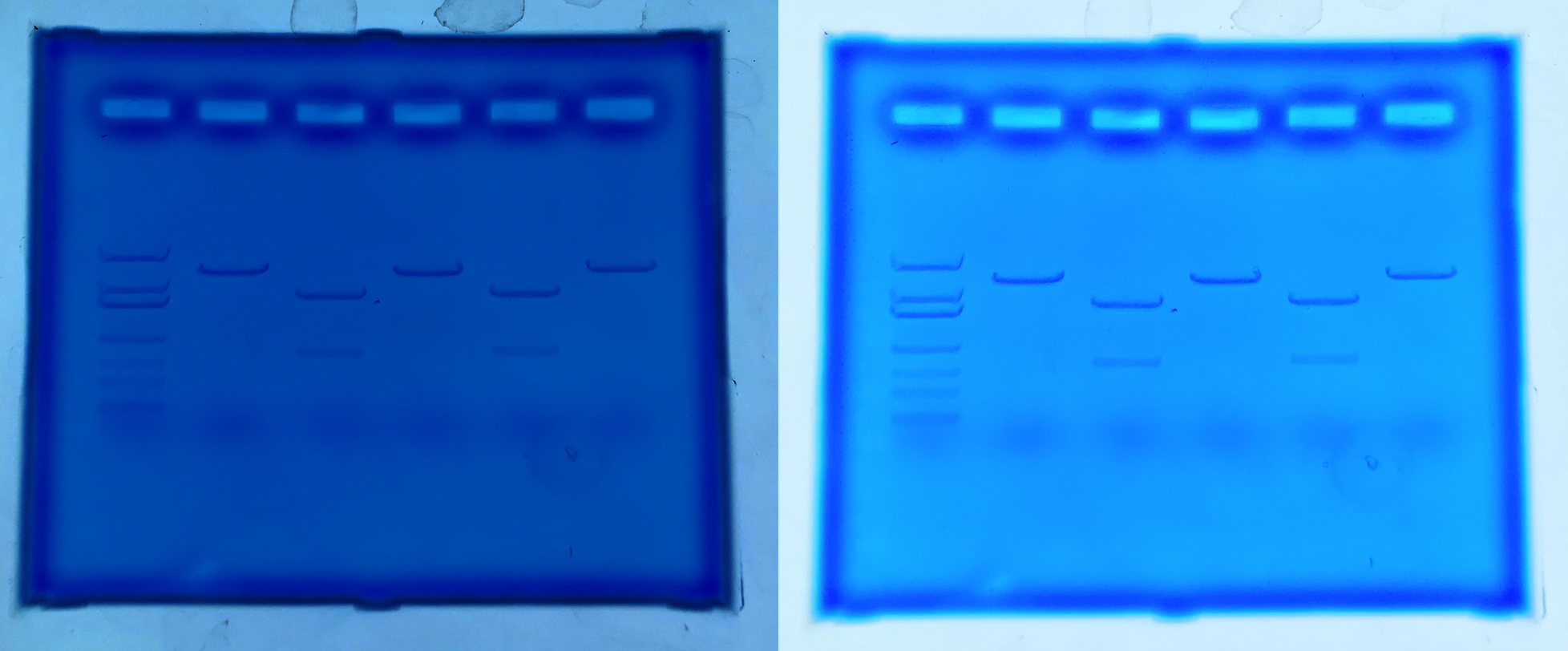 One thing that can very quickly ruin a photo is glare from lights in the room. The worst offender for this tends to be overhead lighting, which reflects off of shiny plastic or wet samples and can mask the results. It can be difficult to avoid overhead glare, but turning off lights or positioning the results in a different location in the room can dramatically improve the resulting image. The pictures to the right demonstrate the impact that overhead lights can have when viewing Green Fluorescent Protein-expressing bacteria. The images were taken with the overhead fluorescent lighting on (top) or after shutting the lights off (bottom). As you can see, the image taken in the dark is much easier to analyze and is more representative of the real-world results.