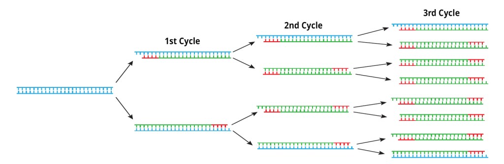 - The heart of PCR’s prowess lies in its cycles, which have the remarkable ability to exponentially amplify the quantity of DNA. This means that even if you start with a small sample of extracted DNA (containing only a few hundred DNA strands) these strands can quickly amplify to a mass of DNA visible to the human eye. With the image it’s easy to grasp this concept: on the right is the starting point of one single strand of DNA which by cycle three has been turned into eight strands. Now imagine what would happen after 25-35 cycles of amplification!
