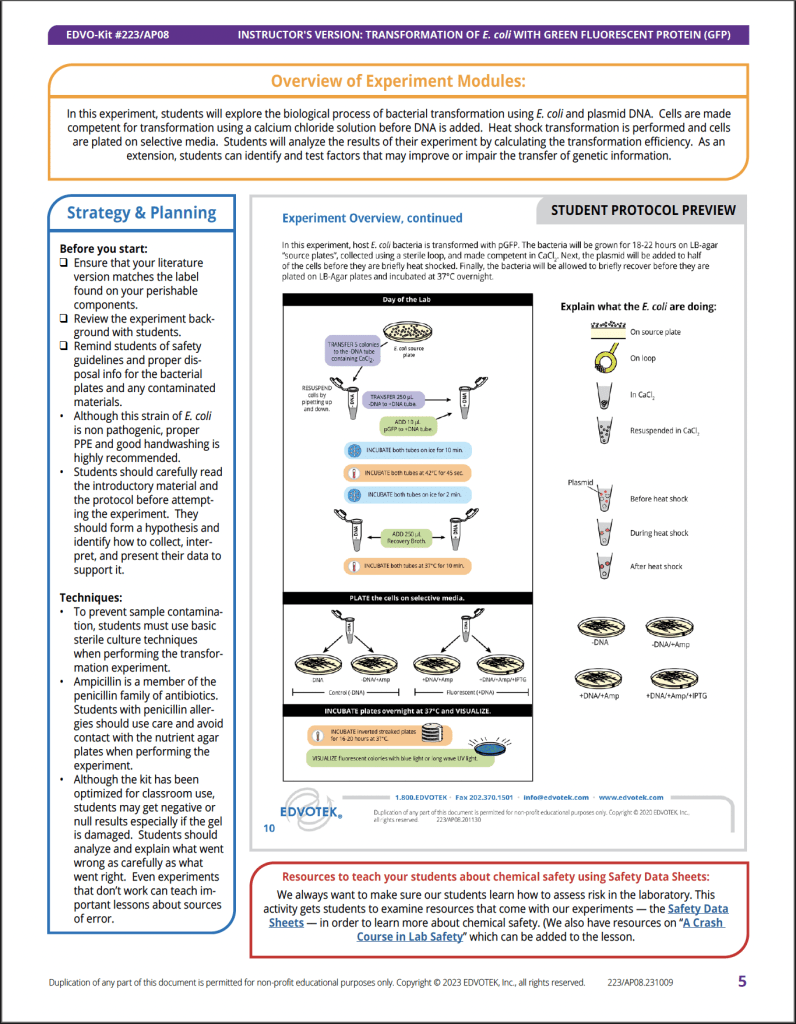 EDVO-Kit #223-AP08 Transformation of E. coli with Green Fluorescent Protein (GFP)