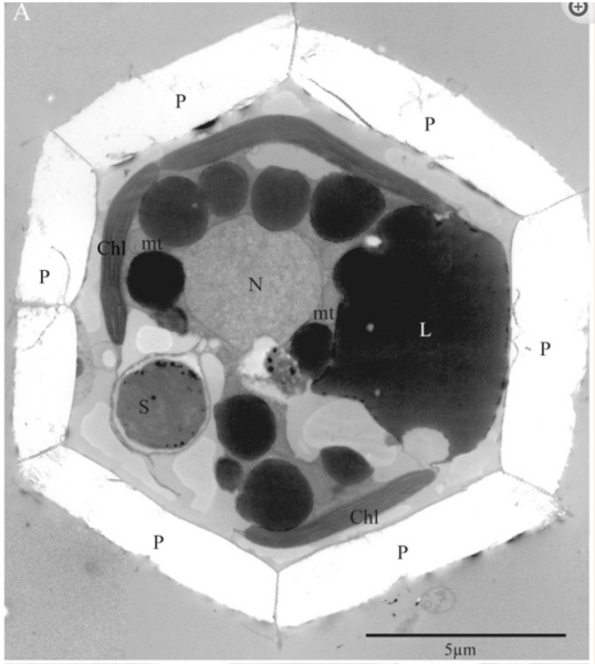 With a lab-ready system finally in place thanks to Dr. Hagino’s work, scientists were set to study B. bigelowii and UCYN-A together. One of their approaches was to peer inside the cell using transmission electron microscopy (TEM). This powerful imagining technique uses electron beams instead of light to visualize specimens at incredibly high resolutions. In this case it allowed them to see inside living B. bigelowii cells at an unprecedented magnification.