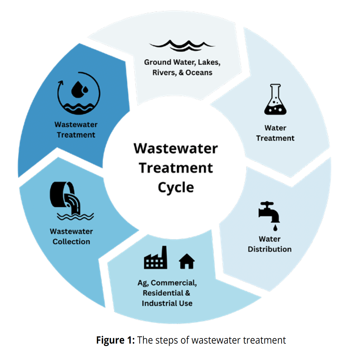 In simple terms, wastewater is the used water that flows out of our homes, schools, businesses, and farms. Because it has been used, it can contain a wide variety of substances that are not healthy for human consumption. This can include food waste, fertilizers, chemicals, and yes — everything and anything that has been flushed down the toilet. Before this wastewater can be released back into lakes, rivers, and oceans, it must be collected and made safe at a wastewater treatment facility (Figure 1). This includes removal of debris from the wastewater, filtering of sediment, elimination of contaminants, and disinfection to prevent the spread of diseases.