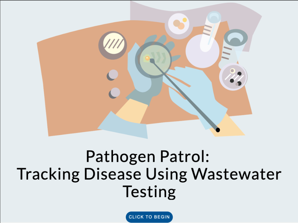 We have designed multiple educational resources to help you teach this lesson about disease detection and prevention, including videos, powerpoint slides, career resources, a detailed real-world scenario, and a new FREE interactive e-learning module! Through this virtual investigation (complete with some escape-room style puzzles), students learn how biotechnology tools like wastewater testing are used to track disease and protect public health. Try it out and let us know what you think!