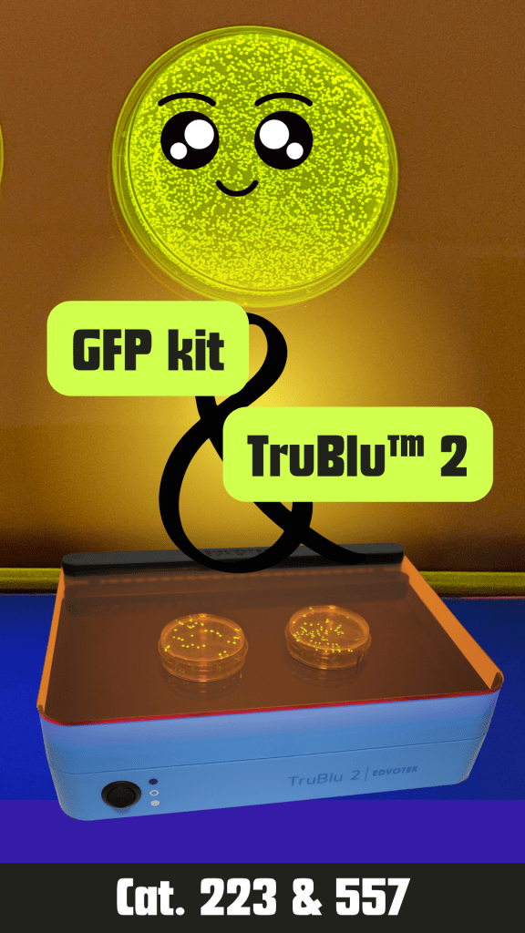 In this experiment, students will explore the biological process of bacterial transformation using E. coli and plasmid DNA. This “programs” the bacteria to create the green fluorescent protein, which makes your bacteria glow beautiful and bright when excited with the blue light from the TruBlu2.