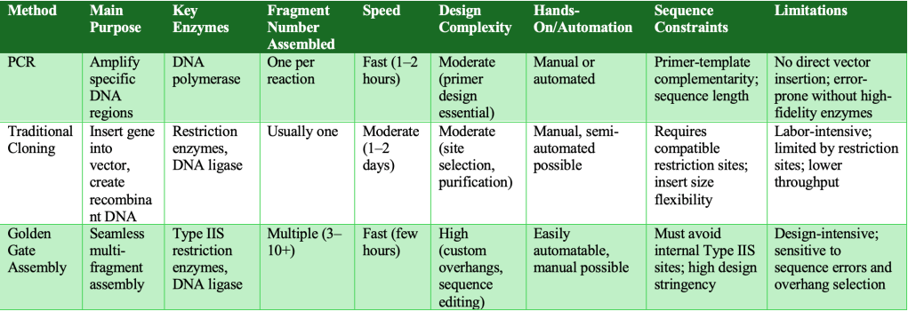 Comparative Analysis: PCR, Traditional Cloning, and Golden Gate Assembly
