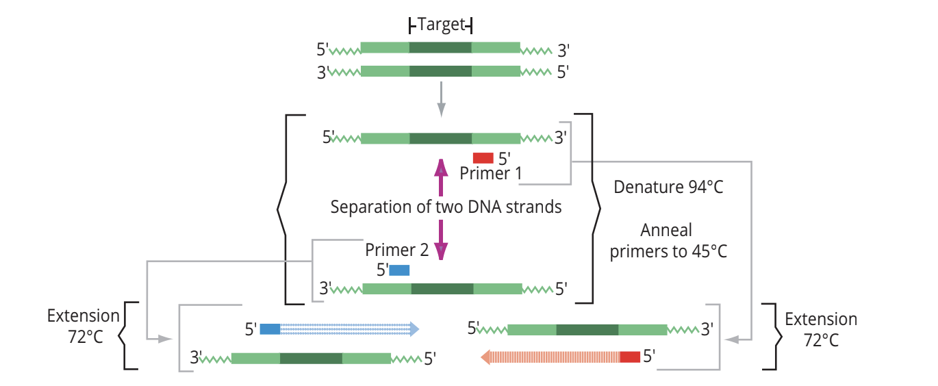 - Mechanism: The reaction involves three primary steps: denaturation (typically 94–98°C), annealing (primer binding at 45–65°C, sequence-dependent), and extension (DNA synthesis at 72°C). This cycle is repeated 25–40 times, resulting in the geometric amplification of the target DNA region.